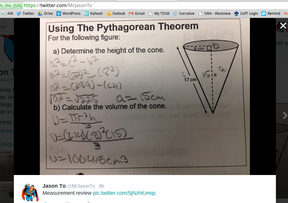 From my 5 months of experience using Twitter to show student work, I have found it to be very effective in hooking students and also sharing quality work amongst everyone. I would recommend others to try this out, especially if you don’t have a document camera. I think there’s also a mild cool factor that attracts the students because it involves Twitter, something that’s pretty hip with the young ones these days. If anyone can think of a way to show student work using SnapChat, send me an email,