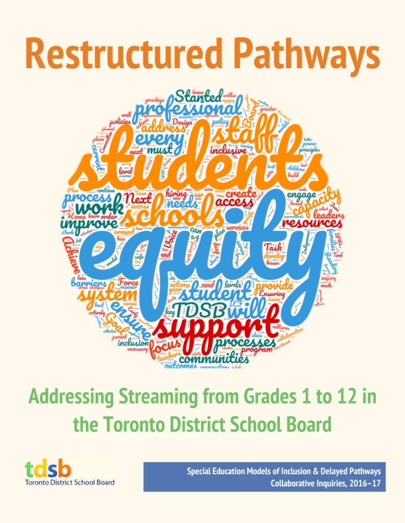 To, J., Lloyd, E., Bacchus, N., & Gaymes San Vicente, A. (2017). Restructured pathways: Addressing streaming from grades 1 to 12 in the Toronto District School Board. Toronto, Ontario, Canada: Toronto District School Board. https://drive.google.com/file/d/0B6W69r2qnlyoWHFERzBZSC1Ua1VBTHBCZ1ZOdmxkczZvNXB3/view?resourcekey=0-duvtnYOgDc32VeRvtO2e1A